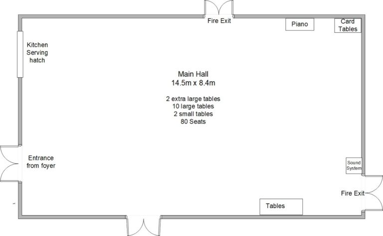 Our main hall can seat 100 persons when the chairs are arranged 'theatre style' and there are a variety of tables suitable for all occasions.